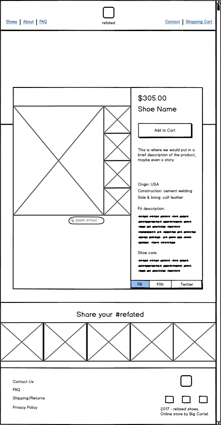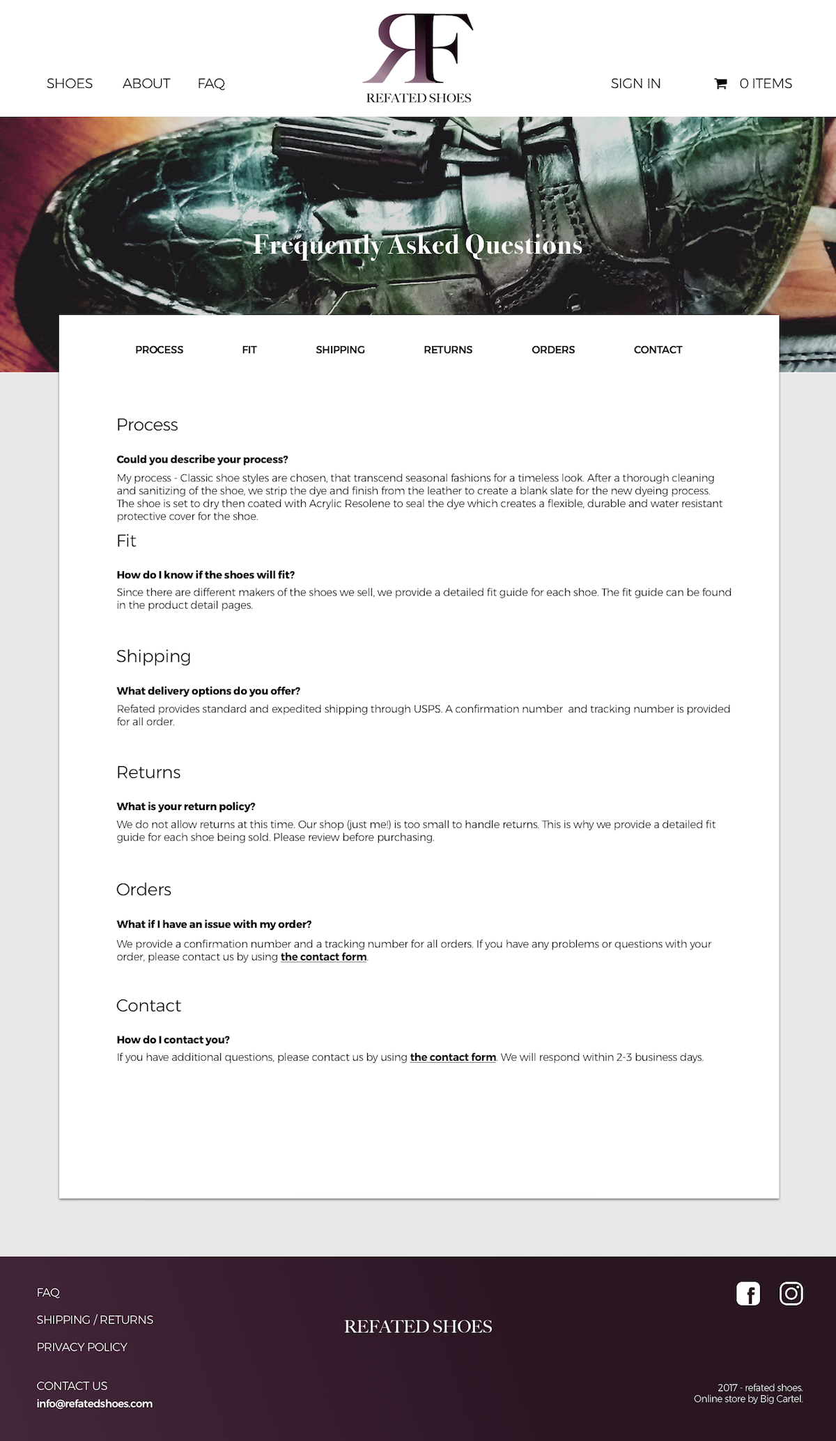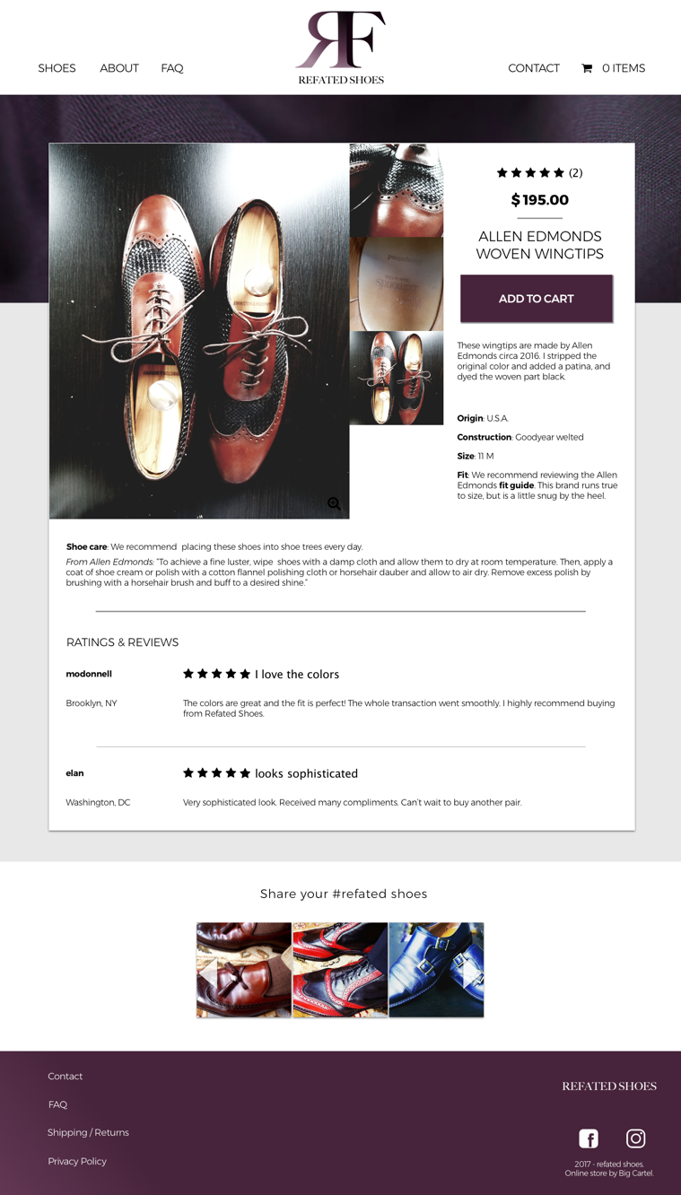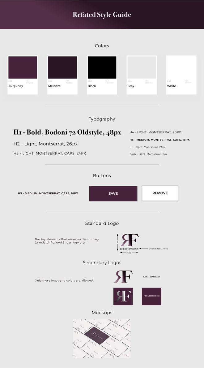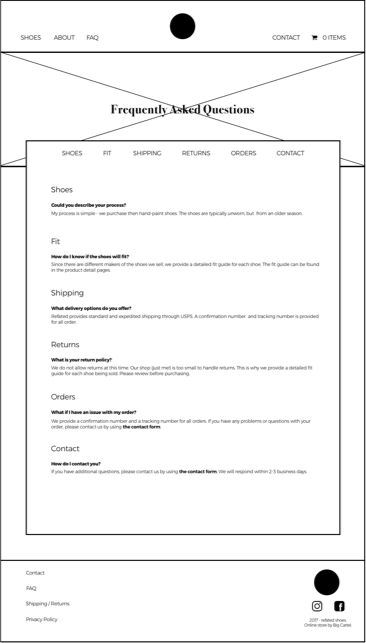 Working directly with the client, I always try to understand their goals and needs are before starting anything. The client’s mission for his company, Refated Shoes (RFS) is to repurpose and redesign older shoes. Although it is a sustainable business model, the client chose older shoes because he preferred the canvas they provided. He also viewed this as an art form rather than strictly a business, so revenue wasn’t his ultimate goal.